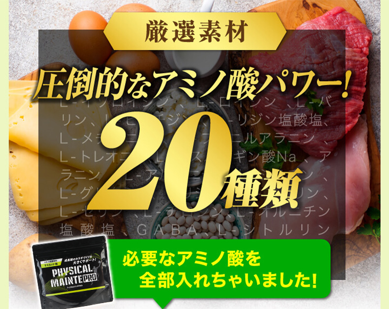 成長期に必須とされているアミノ酸は「必須アミノ酸」と「非必須アミノ酸」に分かれており、計20種類あります。このうち必須アミノ酸は体内で生成することが出来ず、食事から補う必要があるのですが「フィジカルメンテプロ」なら1日1杯ですべてのアミノ酸を賄うことが可能です。